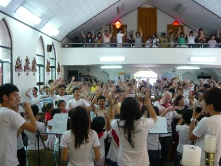 7/17莫拉菲颱風過境,在這前一天仍是讓人憂慮的時風偶雨;7/18卻天候宜人,9點不到就看到一群群人潮,扶老攜幼地湧進聖堂大院,這不由得讓我們讚美天主,因為「祂將水包裹在濃雲中,祂一噓氣,天氣晴朗。」(約廿六8a,13a)