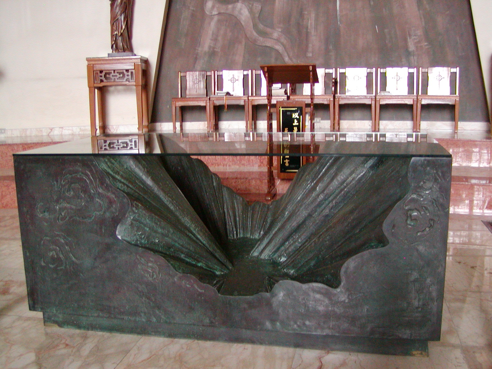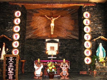 主教所講的是原住民聖堂,若是漢族的聖堂,我喜歡嘉義的田耕莘樞機紀念聖堂,它裡面是本地藝術家楊英風創作的藝術品:祭台是用老子的概念,以虛懷若谷來描述耶穌謙卑自下、貶抑自己、自我空虛的生命態度;十字架苦像的雕塑,耶穌的心是完全鏤空的。