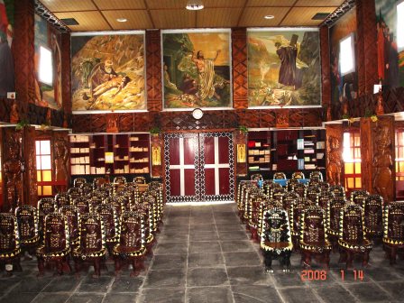 自從60年前教會來了之後,開始蓋這樣的教堂,讓我們看到了一個朝拜神的地方,當中有十字架、聖母像、耶穌像、還有跪凳。這些對我們來講都非常新奇,神父告訴我們:要這樣跪著祈禱…,我們也就一步步地學著做。