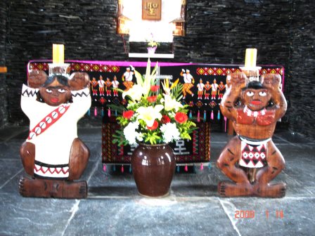 現在還有幾個聖堂慢慢往本地化方向走,像金崙天主堂因為蔡神父來了,他雖是印尼籍,但一直在研究這個民族的文化,之後蓋了聖堂,只是聖體櫃、洗禮池…都在聖堂裡,看來合乎禮儀要求,可是一定要加以解釋,否則我們原住民會覺得怎麼一大堆東西都放在裡面。