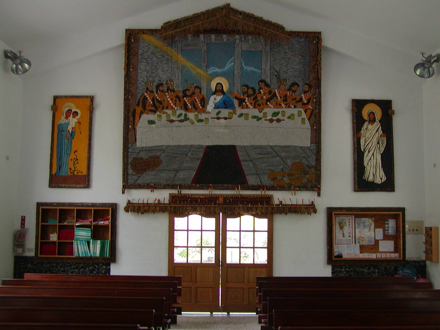 鄉間的教堂如果有空間,內部可以畫上天主教的故事,如十四苦路、廿端玫瑰經等,外部就可以畫上部落的故事,在台東就有兩處教堂做得十分成功。