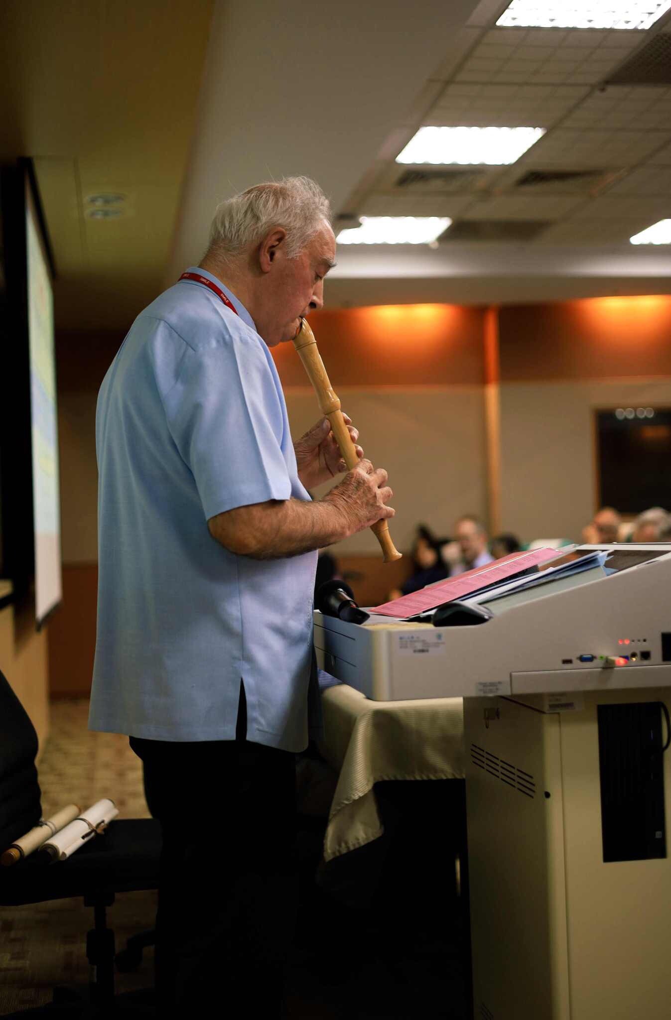 緊接著便是當天會議的亮點,林瑞德神父的長笛演奏,還有其他的一些輔助道具,例如:他展示他所收藏的中國書法卷軸,其中一幅是「悟」,另一幅是「領悟基督的愛多麼廣濶高深。」