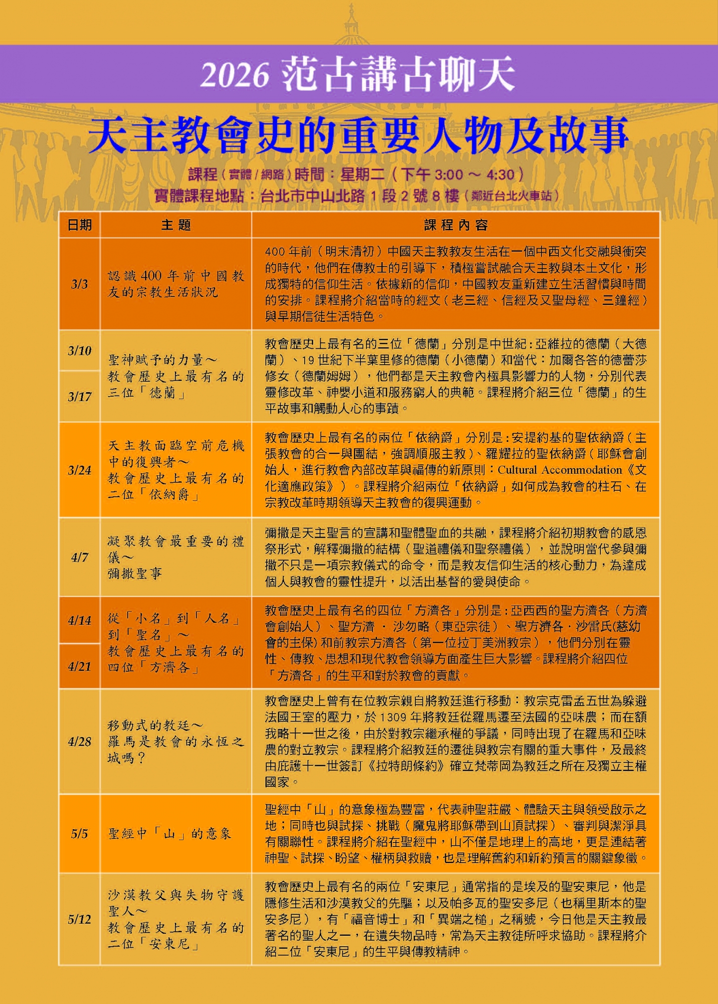 此課程由聖母聖心愛子會前東亞區會長范凱令神父(北京師範大學哲學系宗教學博士)及台灣大學歷史系名譽教授古偉瀛(加拿大英屬哥倫比亞大學歷史學博士)兩位主講,從不同角度、採互動方式,探討這些人物及事件對教會的影響,內容豐富、精彩可期。