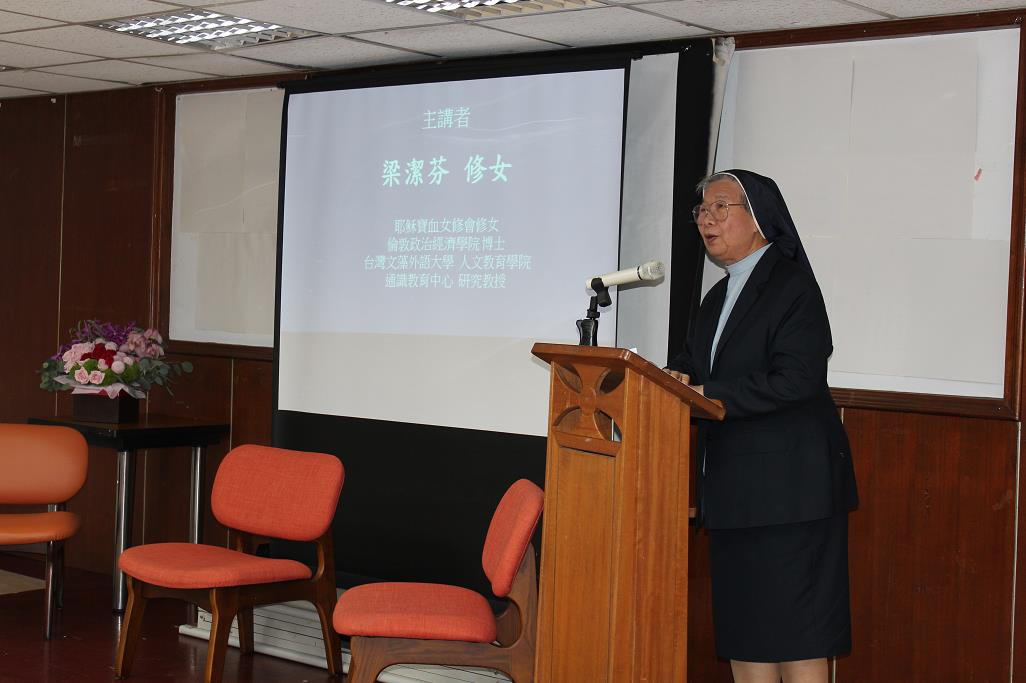 此次座談會之第一位主講人梁潔芬修女,對於中梵協議曾多次發表相關的評論。座談會當天,梁潔芬修女從國際政治的角度,探討中梵協議對於天主教徒和普世華人教會的影響,並陳述台灣天主教會可以在文化、學術、宗教、社會等方面努力,讓台梵關係有更多的合作機會及持續發展的空間。