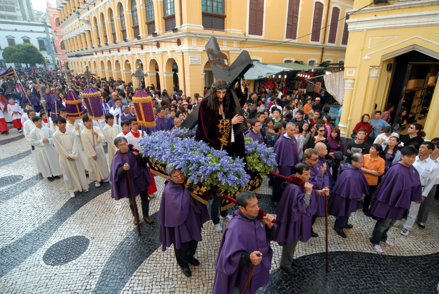 例如每年四旬期首主日的「苦難耶穌像遊行」(圖一),聖週五的「耶穌聖屍遊行」,5月13日的「法蒂瑪聖母像遊行」(圖二)等,不僅是澳門教區一年一度的禮儀盛事,也是城中大事,很多外地教友都來參加。今年2017的「基督聖體聖血節」,教區也會舉行「聖體遊行」。還有值得一提的,在澳門每年11月2日的追思已亡,和12月8日聖母無原罪瞻禮,在澳門是法定公眾假期。