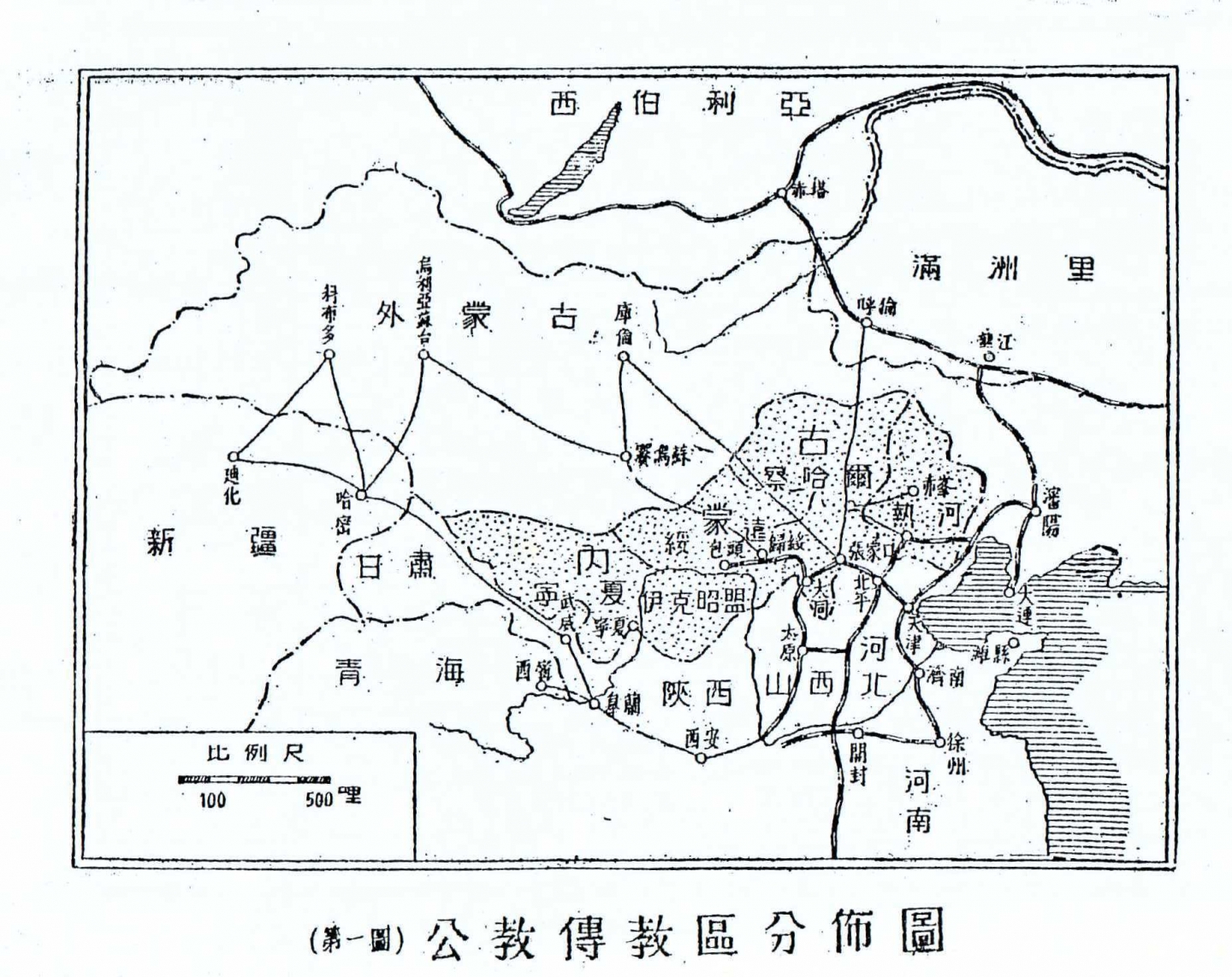 十九世紀中葉,比荷兩國天主教教士有志來華傳教的,組織了一個傳教會,名「聖母聖心會」,1864年,由羅馬教廷指定中國長城以北的內蒙地區,也就是現在的熱河省、察哈爾省、綏遠省、寧夏省以及陜北三邊地區,作為該會會士傳教的區域,1922年,復將山西省雁門關外以北六縣,一併劃分在內。這個傳教區域,幾盡為高原,平均高度為海拔700至2000公尺,它的東北西三面為興安嶺、陰山和賀蘭山,南面則以長城為界。