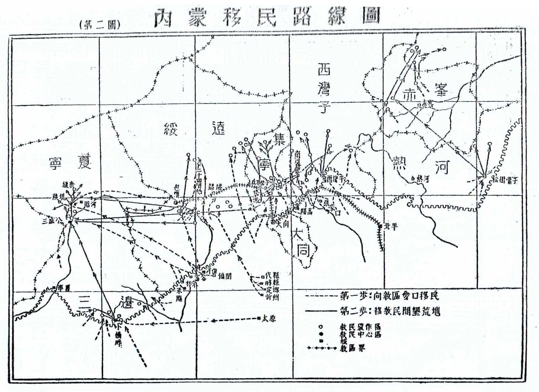 移民殖邊運動,原是很久就有的,但是事屬初倡,成效未見大著。按歷史考據,1689年尼布楚條約以後,內蒙整個地區劃入中國版圖,漢民在18世紀中葉開始由古北口、喜峰口向關外蒙古地區遷移,1778年的時候,由於內蒙王公不斷的興兵倡亂,政府為了便於統治起見,於是將察哈爾南部,劃入河北省,將綏遠一部劃入山西省。由此時起,張家口、得勝口、殺虎口、又成了移民的新孔道,當時清廷還是嚴禁人民向關外遷移,常常以死刑制止婦女出關,至1876年,此項禁令取消,移民這才暢行無阻。日俄戰爭後,政府為充實國防,始鼓勵人民向邊陲移殖,迨至民國成立,更制訂了對遷居關外民眾優待辦法。