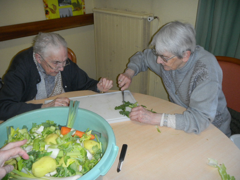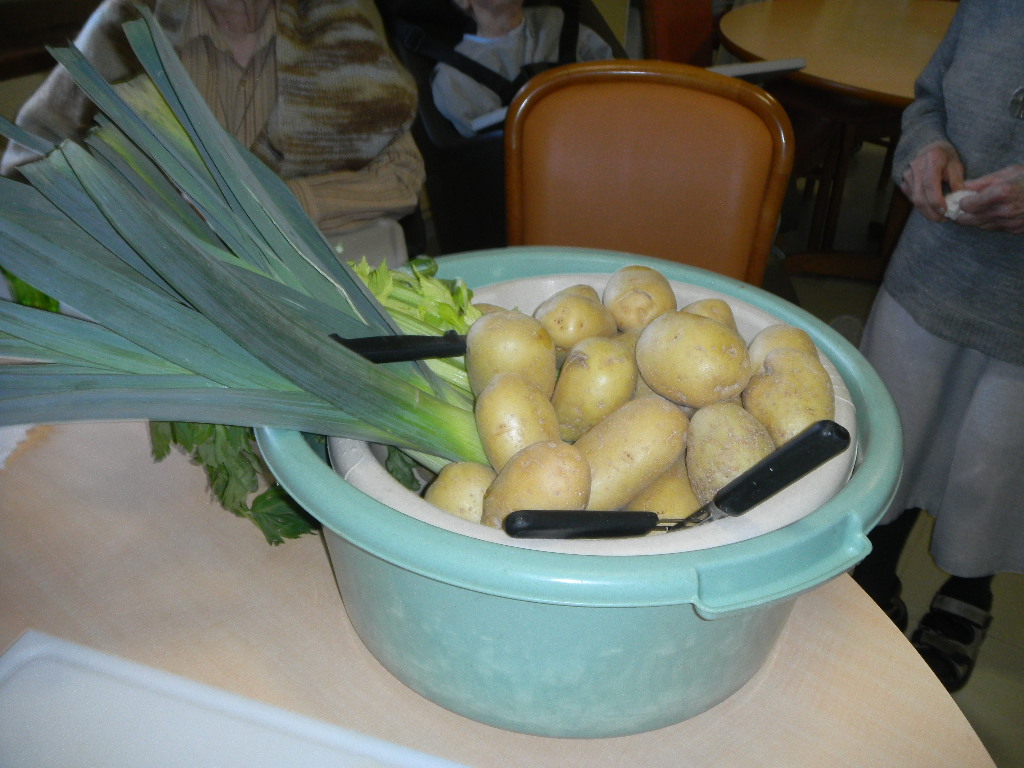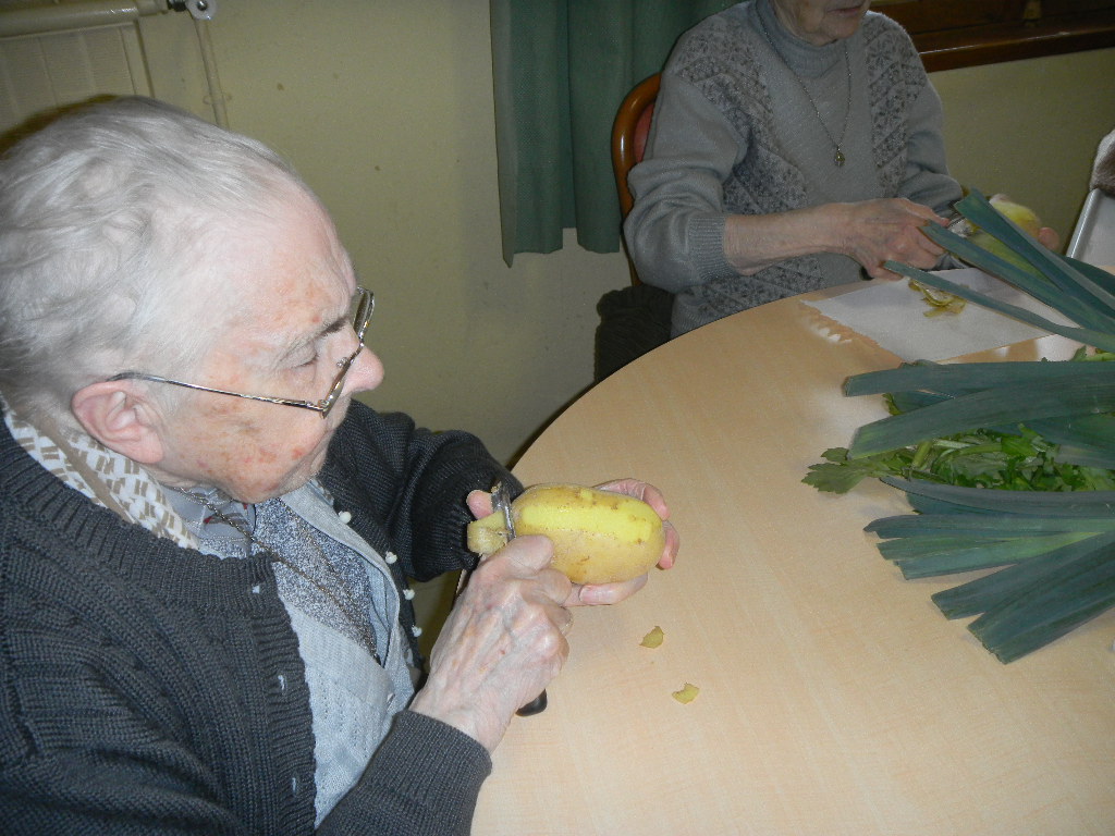 這故事讓廚師想起可以當作一個眼手協調的工作坊活動,一個月一次。於是在徵求她的上司和我們的行政部主任同意後,她準備不同的根莖類蔬菜,讓患失智症的修女有機會動手;這也同時是餐飲公司對客戶提供的一個特殊活動,一切按工作坊的規則進行。廚師得填寫評估報告:這工作坊對失智症患者的意義與效果。